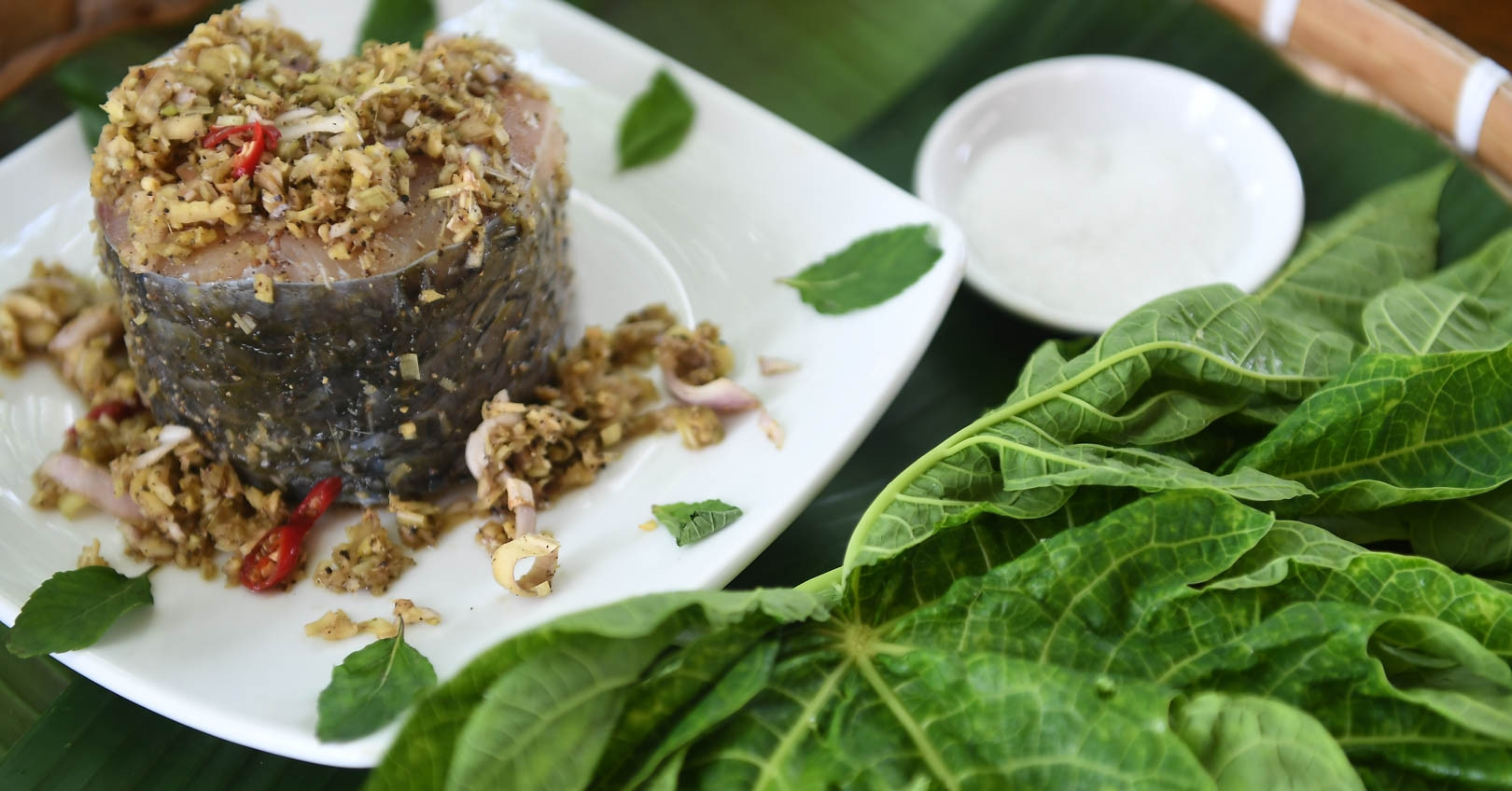 Theo chị Lò Hương Giang, người dân tộc Thái tại xã Xăm Khòe (Mai Châu, Hòa Bình), hiện là đầu bếp tại địa phương, nguyên liệu của món ăn này gồm cá trắm (con từ 3kg trở lên, thường chọn khúc phía thân trên, sát đầu để ít xương và bụng cá rộng), lá đu đủ đực không quá non, không quá già và một số loại rau thơm, gia vị như húng chó, mùi, thì là, hành lá, sả, gừng, mắc khén, ớt, tiêu, hành khô.