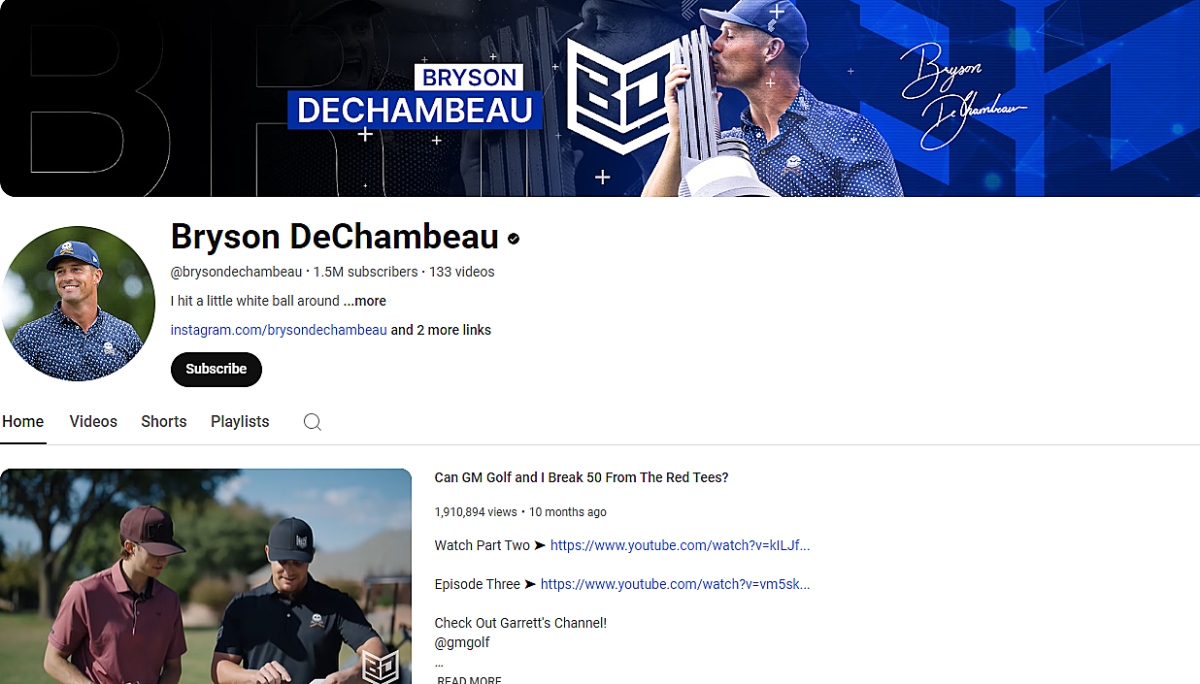DeChambeau đang hơn PGA Tour về mức độ quan tâm nhưng thua xa về chỉ số xem nội dung. Hiện tại, lượt view kênh DeChambeau ở mức 189,3 triệu, còn PGA Tour xấp xỉ 1,738 tỷ. Chênh lệch này chủ yếu do thâm niên hoạt động, quy mô sản xuất nội dung. DeChambeau xuất hiện trên YouTube từ 20/11/2012, đến nay tung lên 133 video trong khi PGA Tour từ 1/8/2006 với tổng cộng 20.607 video.