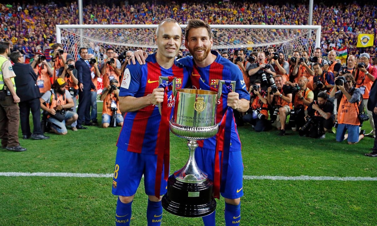 Messi và Iniesta mừng Cup Nhà Vua cùng Barca năm 2017. Ảnh: FC Barcelona