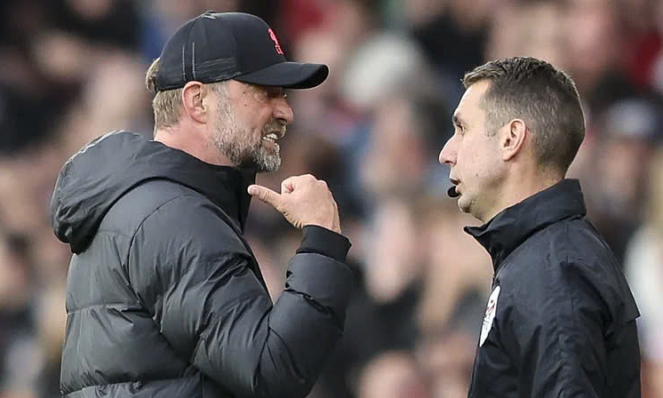 HLV Klopp và trọng tài David Coote trong một trận Liverpool gặp Newcastle trên sân Anfield ở Ngoại hạng Anh ngày 1/9/2022. Ảnh: RTE